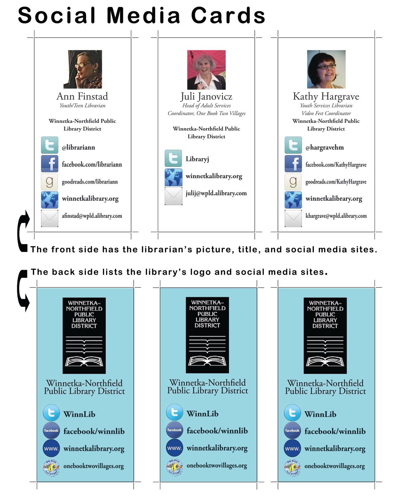 Поэтому можно собрать все в одно место и сделать вот такие визитки-напоминалки. С одной стороны — информация о библиотеке (все официальные адреса, сайты и аккаунты), а с другой — то же самое, только о библиотекаре. Но можно ограничиться только информацией о библиотеке.  Смотрите сами.